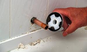 Jälkeen estäen veden, poistamiseksi kahva ja leikata paljastaa venttiilin. Tämä on yleensä yksinkertainen asia pudottaa irti kahvan suojus ja irrottaa alla oleva kiinnitysruuvi kahvan vapauttamiseksi. Peitelevy voidaan kiinnittää myös ruuveilla.